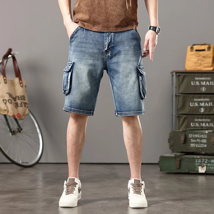 Designed with spacious cargo pockets to keep all your essentials within reach. The rugged, distressed denim offers a trendy, vintage look while providing the comfort you need for all-day wear. Whether you're hitting the trails or the city streets, these elastic denim shorts are your ultimate companion.