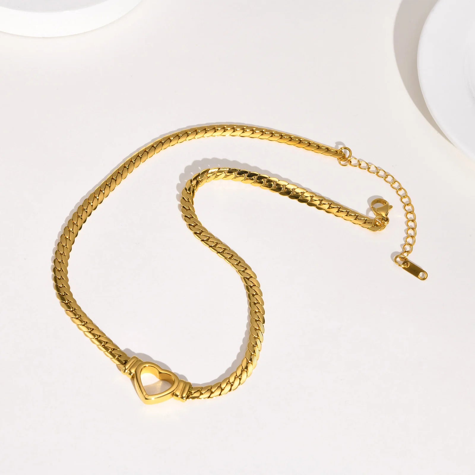 The Sacred Heart is an expression of love's potential, featuring a luxurious shiny gold plated stainless steel hollow heart pendant on a Cuban link style chain. This versatile piece is the perfect accessory for your daily outfit.